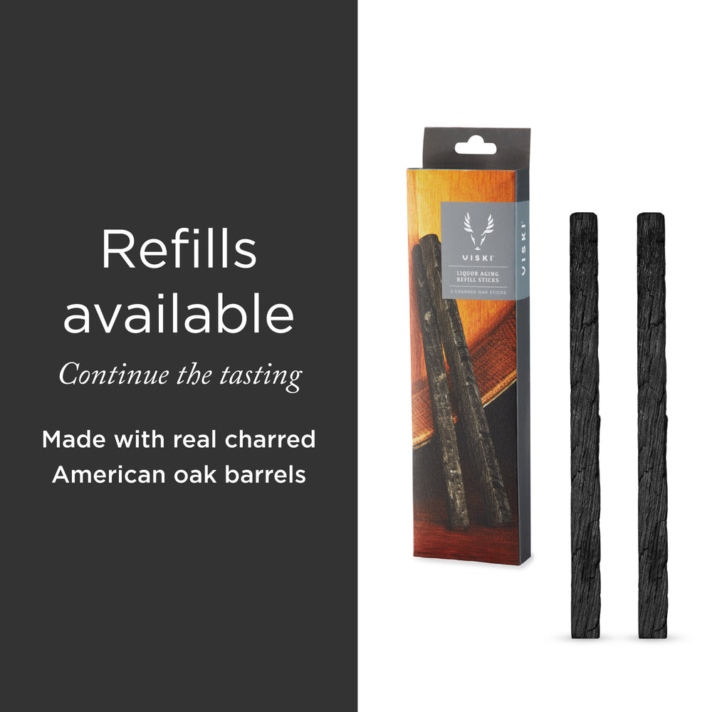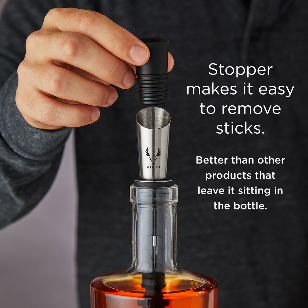 Oak aging provides the unique color, flavor and aroma that we associate with fine spirits. The Alchemi Liquor Aging Kit works by exposing smaller amounts of liquor to a larger charred American oak surface area to improve flavors by rounding out harsh notes. Unlike other infusion sticks, the Alchemi Liquor Aging Kit holds oak in suspension. This means you can easily remove the oak stick instead of leaving it sitting at the bottom of a bottle. When you achieve the perfect flavor, remove the aging stick with one simple step. Charred American oak creates a noticeably smoother, cleaner taste over just a few weeks. Connoisseurs will love comparing aged liquor side-by-side with un-aged to taste the difference. The stopper-pourer also elevates the presentation of any bottle.