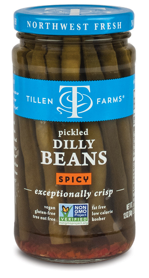 A bestseller since 1984, Tillen Farms Hot 'N Spicy Beans are harvested during a brief period in mid-summer. Only the straightest beans are selected since most beans tend to be long and gnarled. In fact, only about 25% of what comes in is used and the balance is recycled! Tillen Farms' select beans are cleaned, trimmed at both ends, blanched and carefully hand packed so there is no breakage. Possessing the greatest amount of heat, these are widely revered and enjoyed as the world's greatest swizzle sticks for Bloody Marys, the same as are used by leading white tablecloth restaurants and clubs across the country!