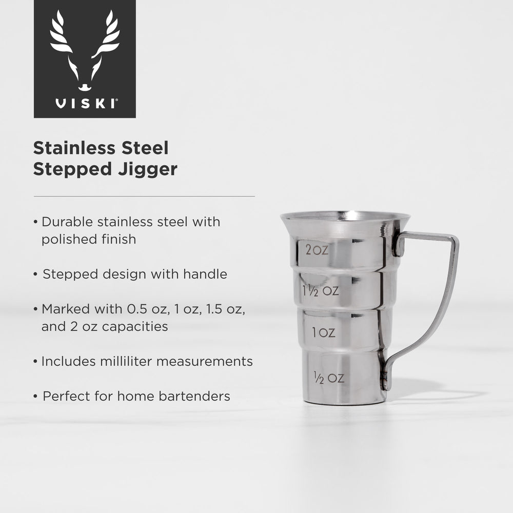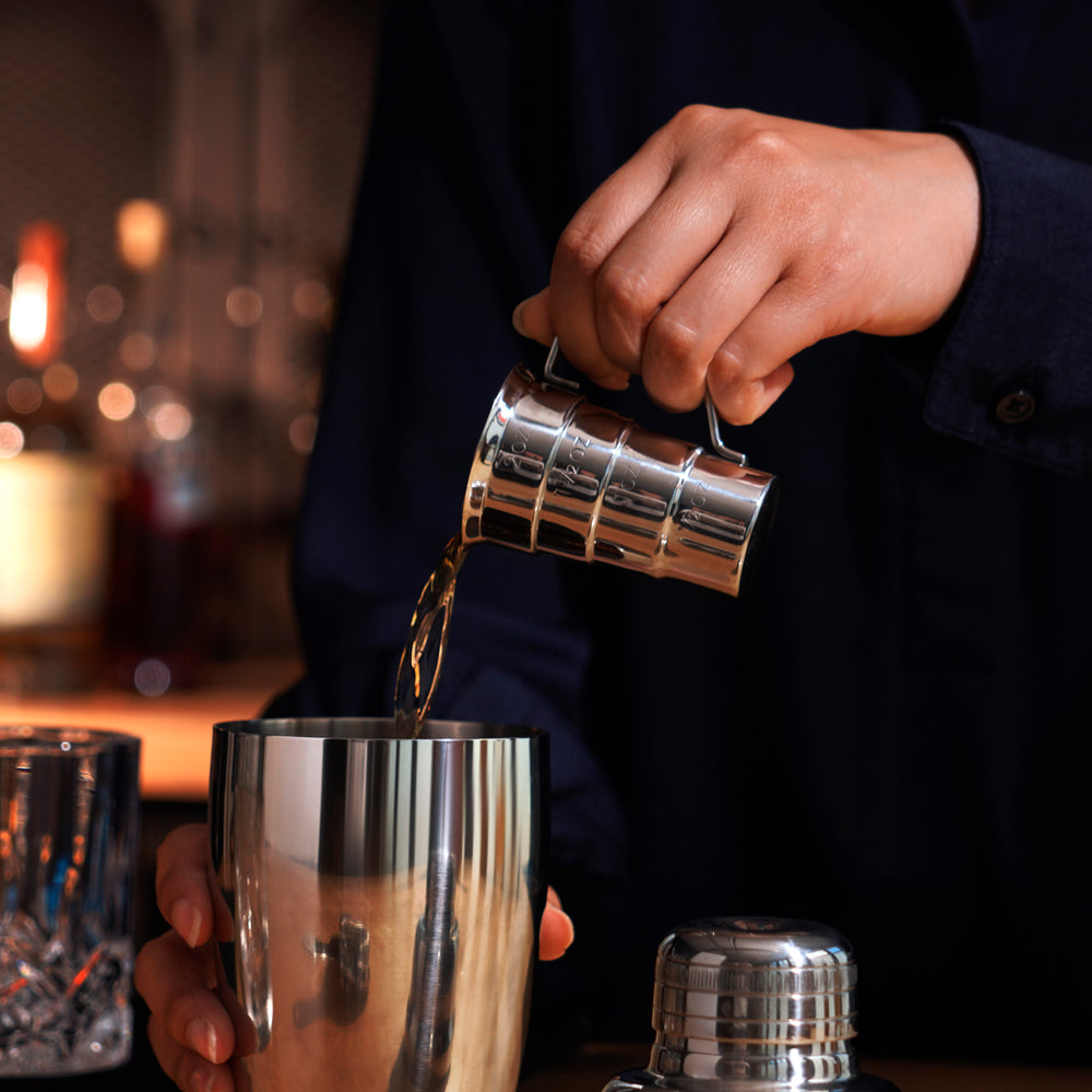 Take your barware to the next level with the Stainless Steel Stepped Jigger. With 4 measurements and external markings, this stepped jigger is a stylish and ultra-functional addition to your barware. The stainless steel finish evokes professional cocktail bar tools, while the handle lets you measure quickly and accurately, no flipping around necessary.