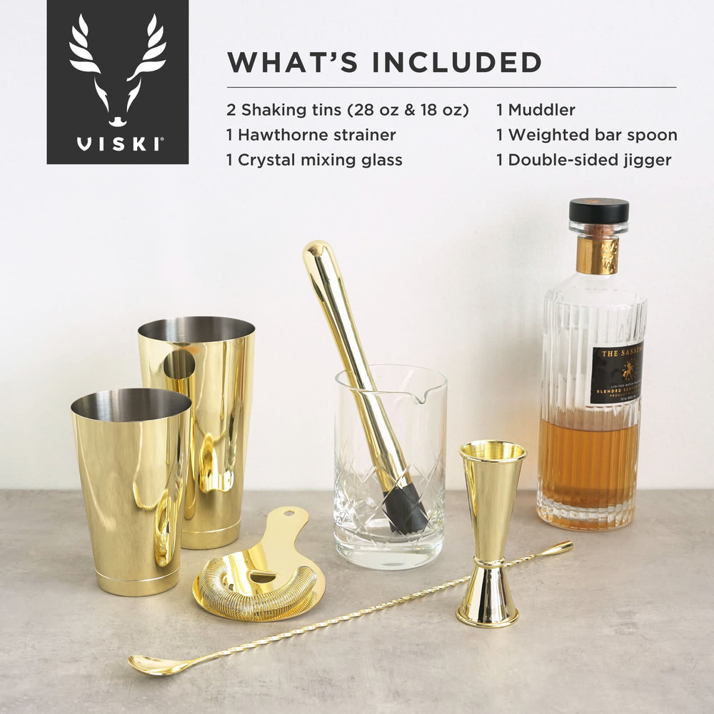 Our 7-piece commercial-grade gold cocktail shaker set has everything you need for making shaken, stirred, or muddled cocktails. With a stunning gold-plated finish, it's ideal for an aspiring mixologist or veteran bartender.