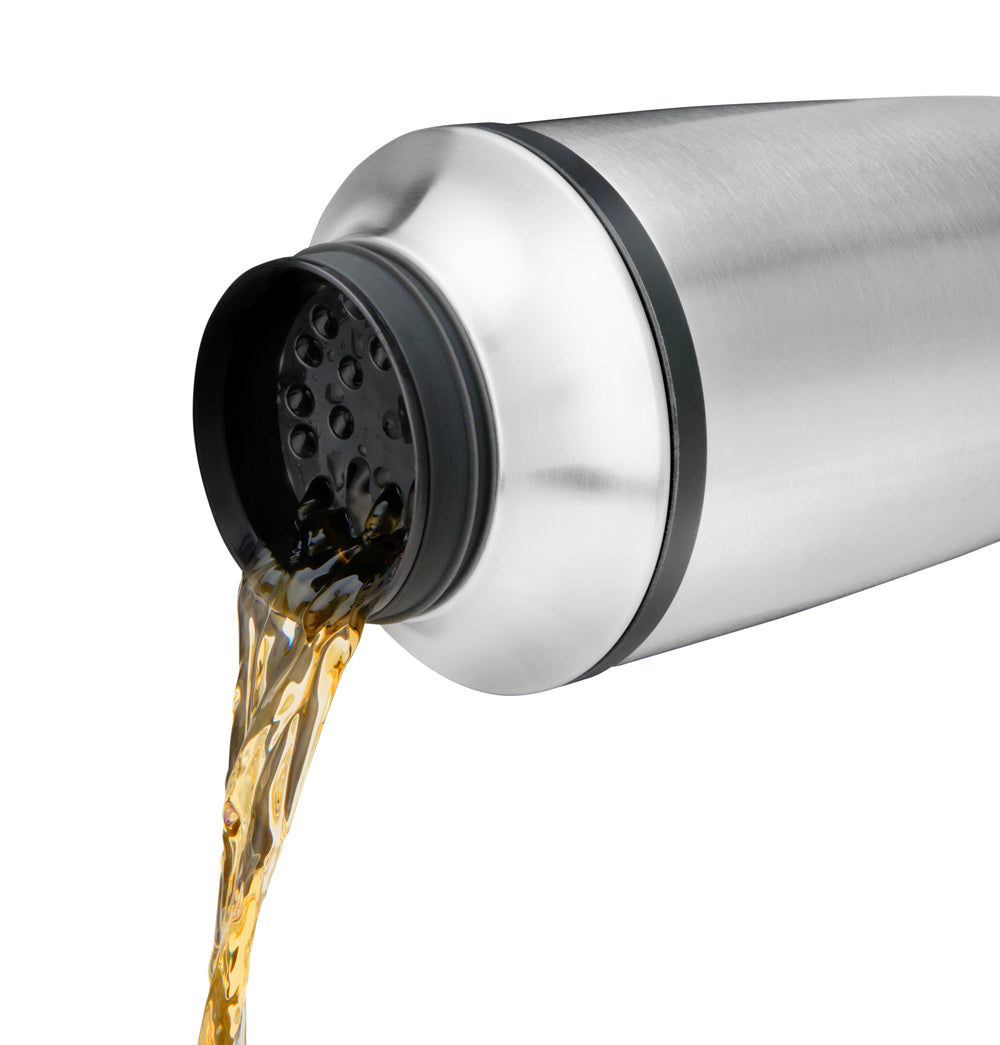 Classic style meets clever design with this Double-Walled Cocktail Shaker. Crafted from double-walled stainless steel, it keeps your drinks icy cold while preventing condensation. The integrated strainer doubles as a citrus reamer, making it easy to juice directly into the tin, while the cap features precise measurement markings for use as a jigger. A watertight silicone seal ensures spill-free shaking, delivering the ultimate convenience for home bartenders and professionals alike. Its minimalist design combines multiple tools in one sleek, functional shaker.