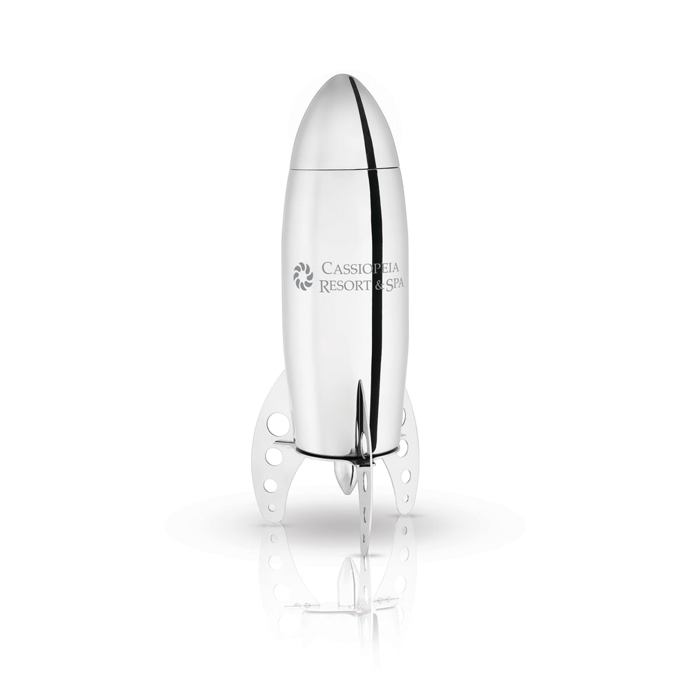 Sleek and space-worthy, our retro rocket cocktail shaker holds 24 ounces and includes a strainer, lid, capsule-esque cap, aerodynamic body, and launch-ready shaker stand.