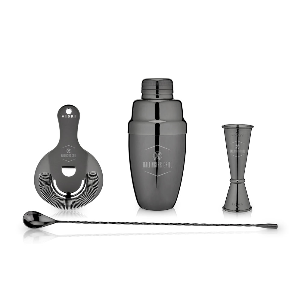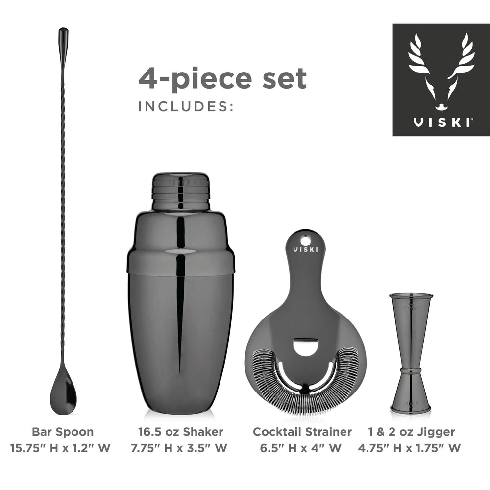 Crafted from durable stainless steel with a black gunmetal finish, this set of four essential bar tools combines style and practicality.