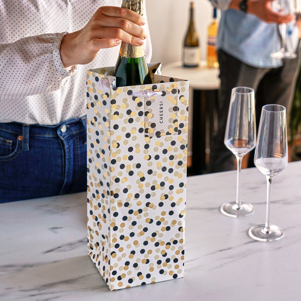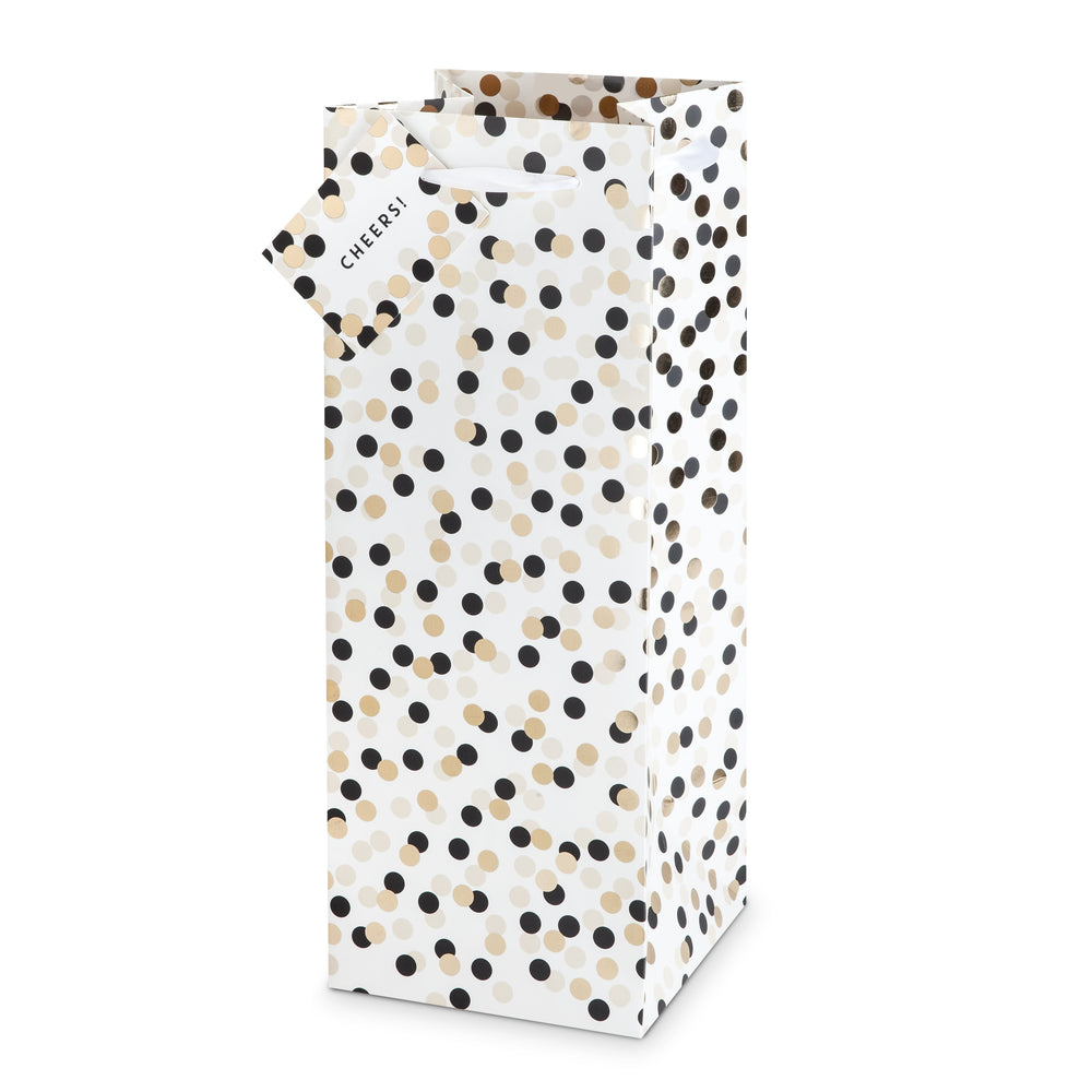 Black, cream, and foiled gold polka dots dance on the surface of this bubbly, celebration-ready bag. Accented with white ribbon handles and a “Cheers!” gift tag, it dresses one bottle of bubbles or booze up perfectly for any occasion.