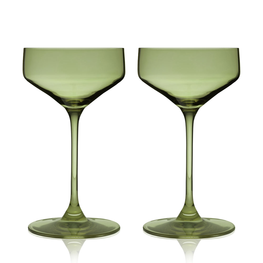 Crafted from European crystal with a gorgeous sage green hue, these coupe glasses bring a soft, lush tint to shaken cocktails. Add some color to your glassware collection with these stemmed cocktail glasses.