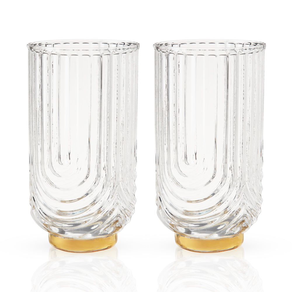 Polished gold and draping glass swathe the surface of this highball glass duo, adding a vestige of the Gilded Age to an already elevated set of glassware. Fashioned from high-quality glass, each tumbler accommodates 15 oz., making them exquisite vessels for your favorite carefully crafted cocktails.