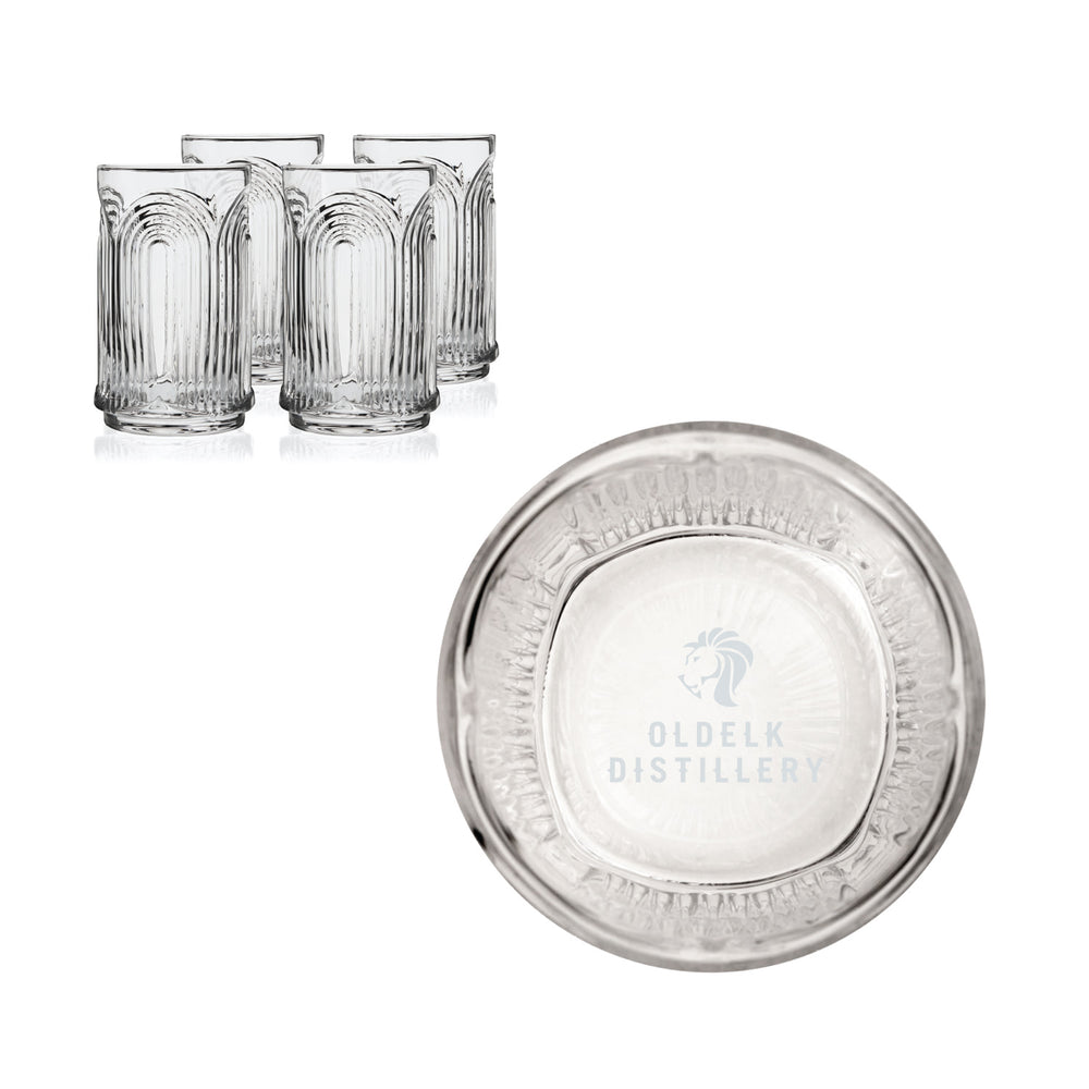 Repeating 3D arches pressed into glass make these vintage-style crystal highball glasses a unique way to serve cocktails or use as water glasses. Dishwasher safe and durable, they bring a retro Art Deco touch to your glassware collection.