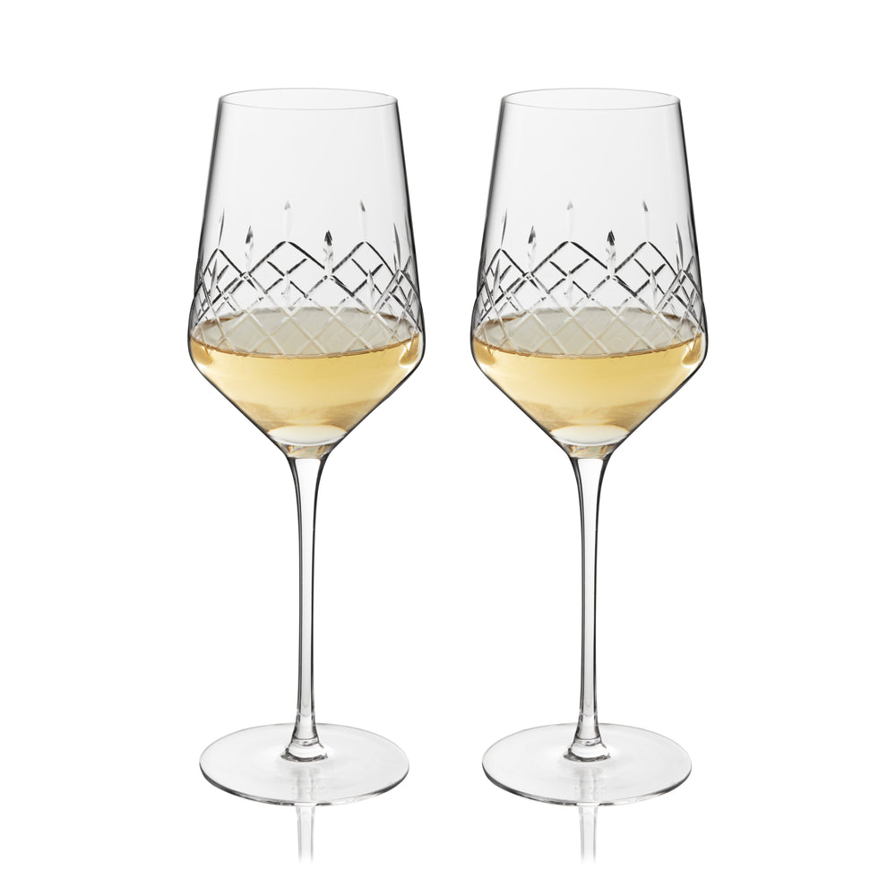 An elegant addition to our best-selling Admiral Collection, these crystal wine glasses combine a modern silhouette with a timeless hand-etched linework pattern. With a generous 19 oz capacity and dishwasher-safe construction, this set of two lead-free crystal glasses is designed for versatile enjoyment and effortless care. Perfect for enjoying your favorite red or white wines.