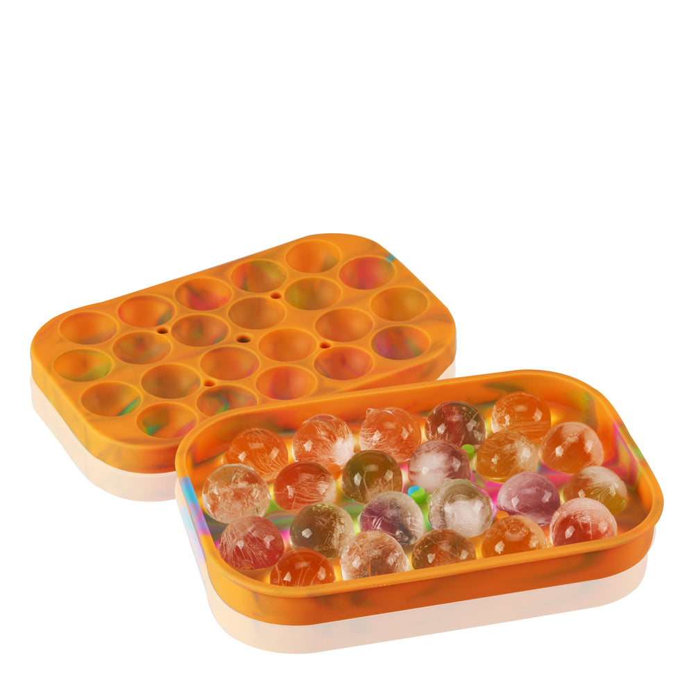 This 22-sphere silicone ice mold creates perfectly round 1” ice balls, ideal for chilling whiskey, cocktails, coffee, lemonade, and infusing fruit and juice flavors. Made from high-quality, food-safe silicone in a colorful marble design, it’s durable, flexible, and versatile. The mold is easy to fill, releases ice effortlessly, and is dishwasher safe for quick and convenient cleaning.