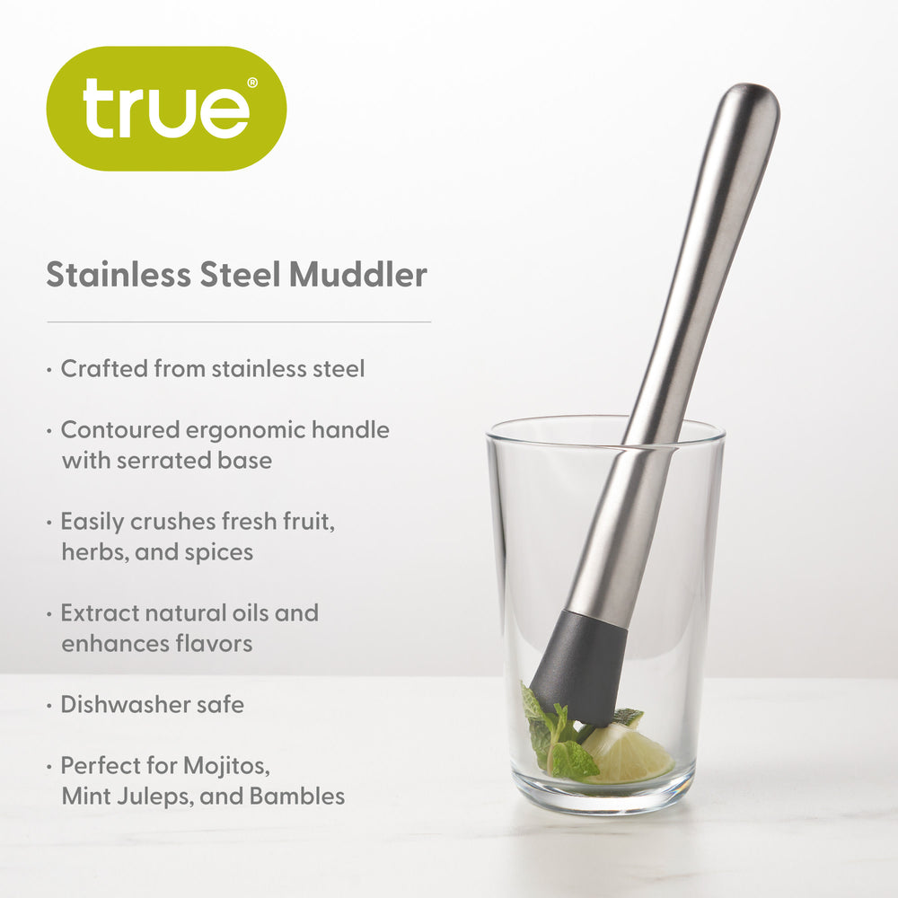 Sleek Stainless Steel Muddler grips citrus fruits, berries, spices and herbs to crush them quickly, and it looks good while doing it. Its sleek Stainless steel handle gives the classic muddler a modern refresh. Step into the future, smashingly good cocktails are just muddle away.