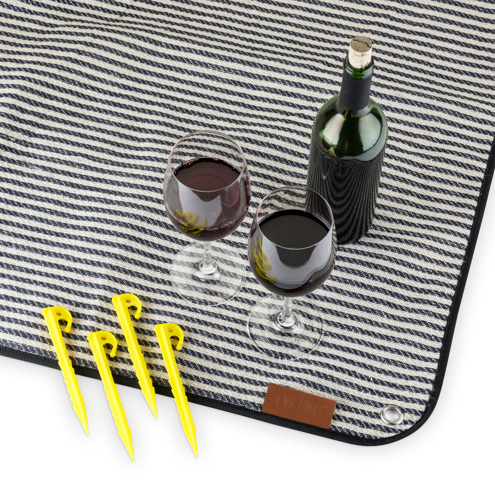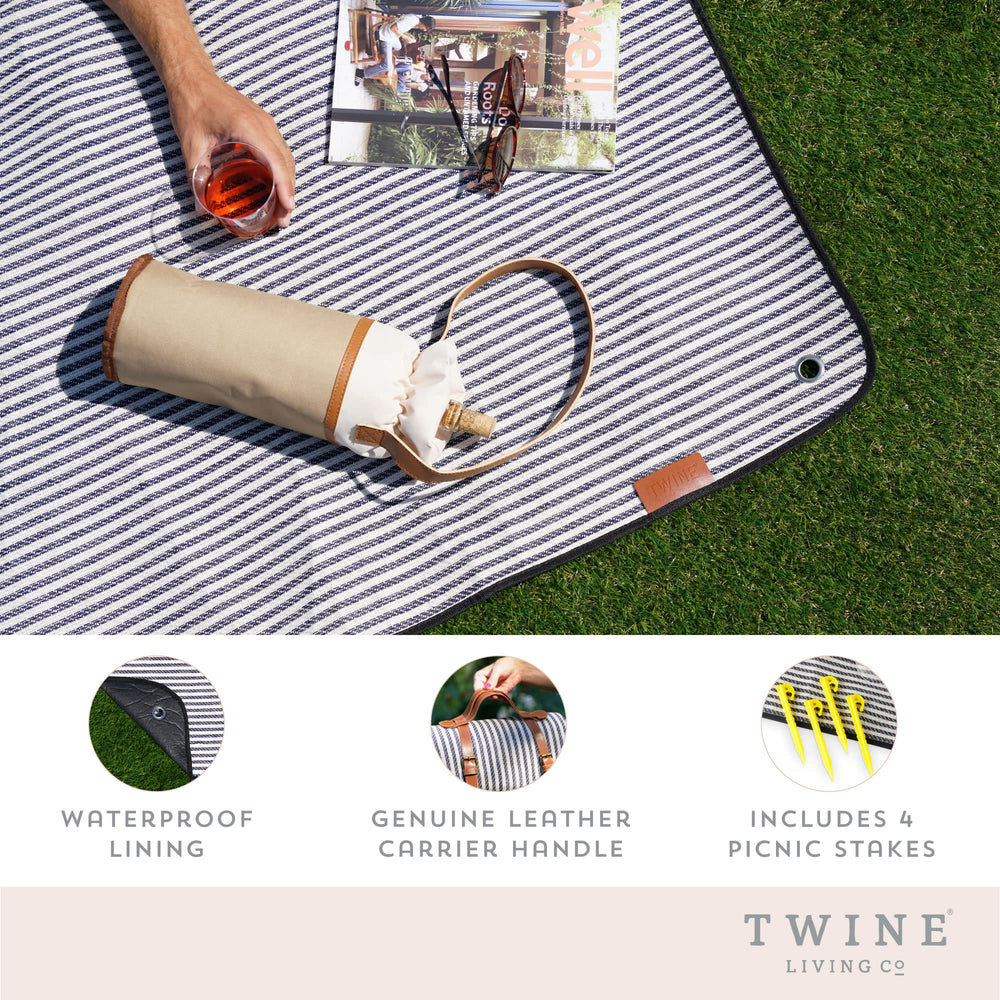 With its nautical pinstripes and waterproof lining, this blanket calls for a romantic picnic under a shady tree or a sunny lunch at the beach. A genuine leather carrier and four picnic stakes are conveniently included for a carefree outdoor date.