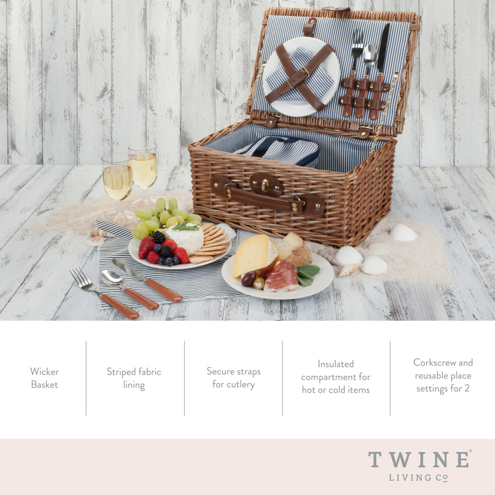 Whether outdoors in warm weather or inside on a rainy day, our woven wicker picnic set is packed and perfect for two anytime. Includes stainless steel utensils, ceramic plates, cloth napkins and plastic wine glasses, plus one white Truetap corkscrew.