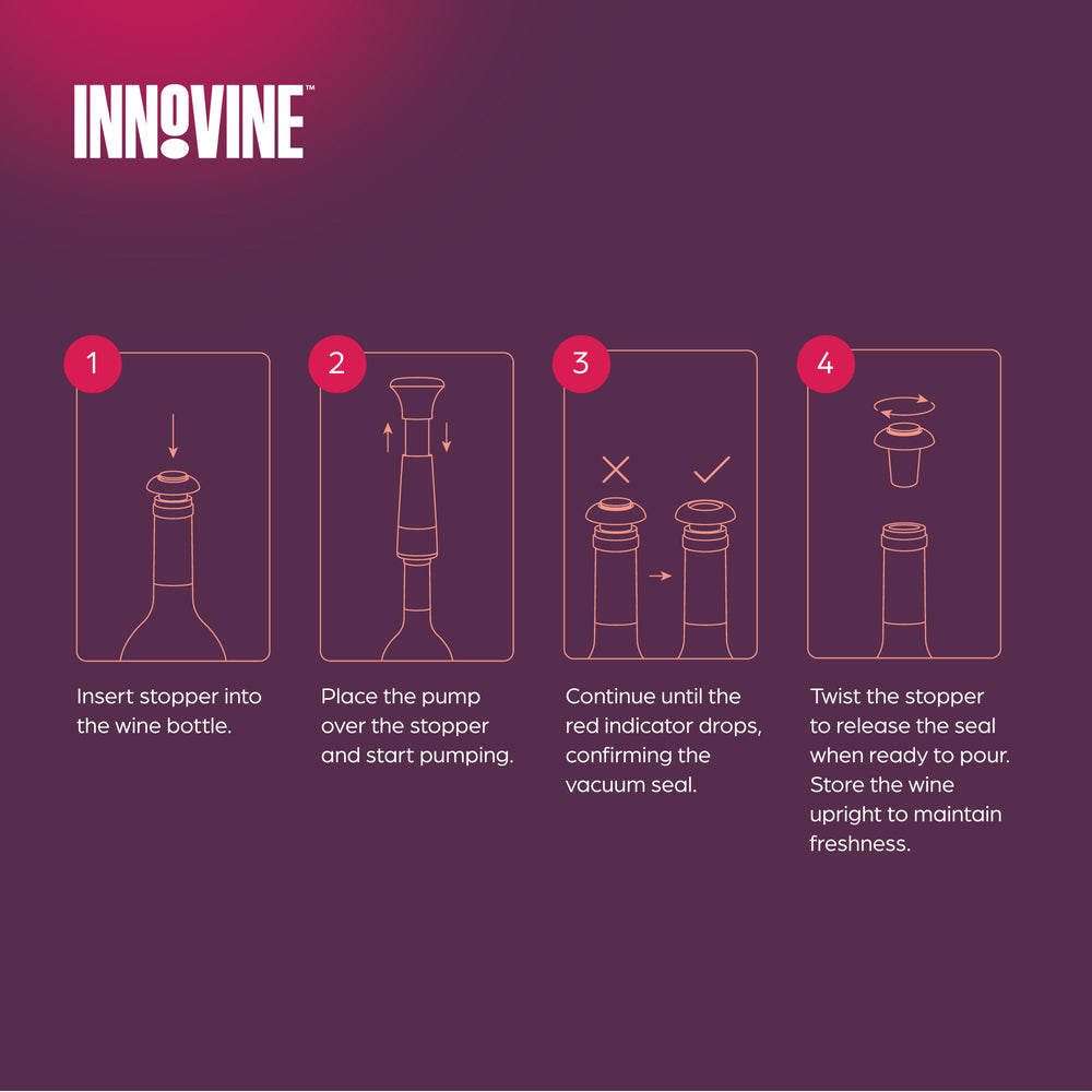 Extend the life of your wine with this vacuum pump wine saver set. Simply insert one of the reusable stoppers into the bottle and use the ergonomic pump to remove excess air, preserving the wine's flavor and aroma by preventing oxidation. The built-in red indicator drops to confirm a vacuum seal, ensuring maximum freshness every time. With a sleek design and easy operation, this set is perfect for wine enthusiasts who savor their wine over several days.