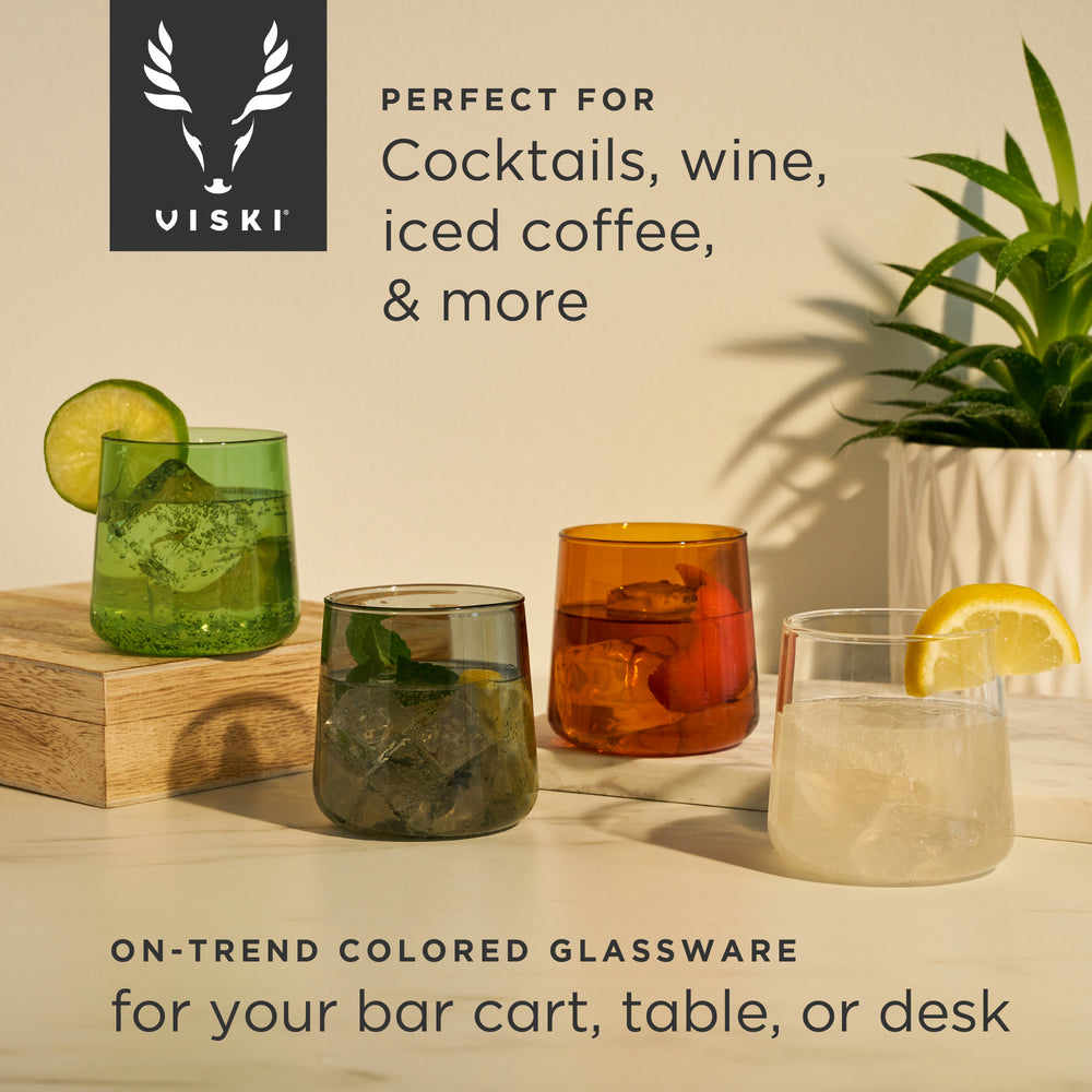 Handcrafted from durable, colorful glass, this set of multicolored cocktail glasses in muted jewel tones brings a pop of color to your glassware collection. Suitable for cocktails, wine, or iced coffee, each stemless wine glass holds 10.5 oz. and is dishwasher safe.