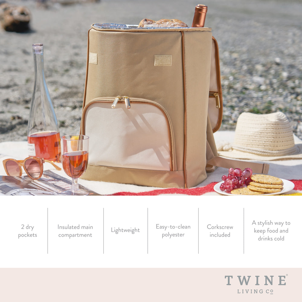 Keep drinks, appetizers, or cheese cold with this insulated backpack. Perfect for picnics, it includes straps, two front pockets, an insulated liner, and a corkscrew.