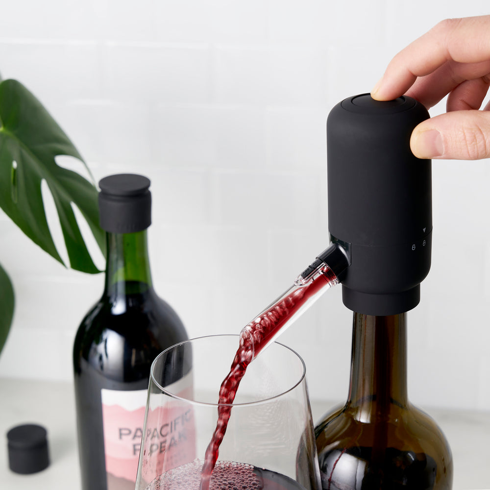 Tired of letting your wine breathe for hours before drinking? The wait is over! Now you can refill your glass and aerate your wine while you pour. This electric aerating wine pourer fits right on standard wine bottles so you can easily pour another round at the push of a button.