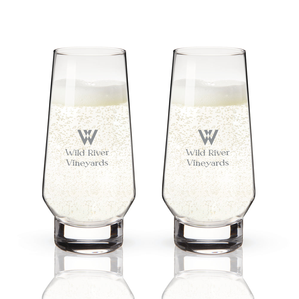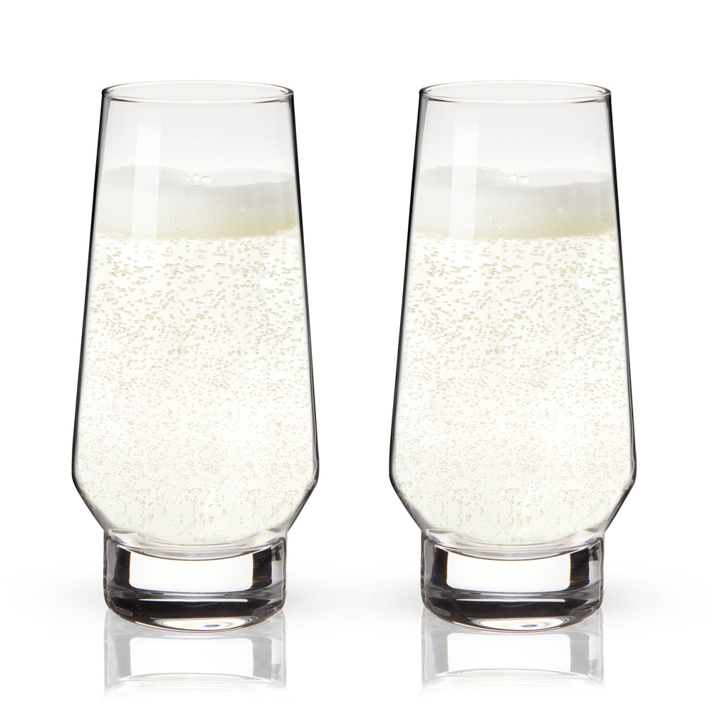 With a tapered rim, rounded silhouette and heavy base, these crystal champagne flutes have a modern look and substantial stemless base, ideal for your favorite prosecco, a simple mimosa, or elaborate Champagne cocktails.