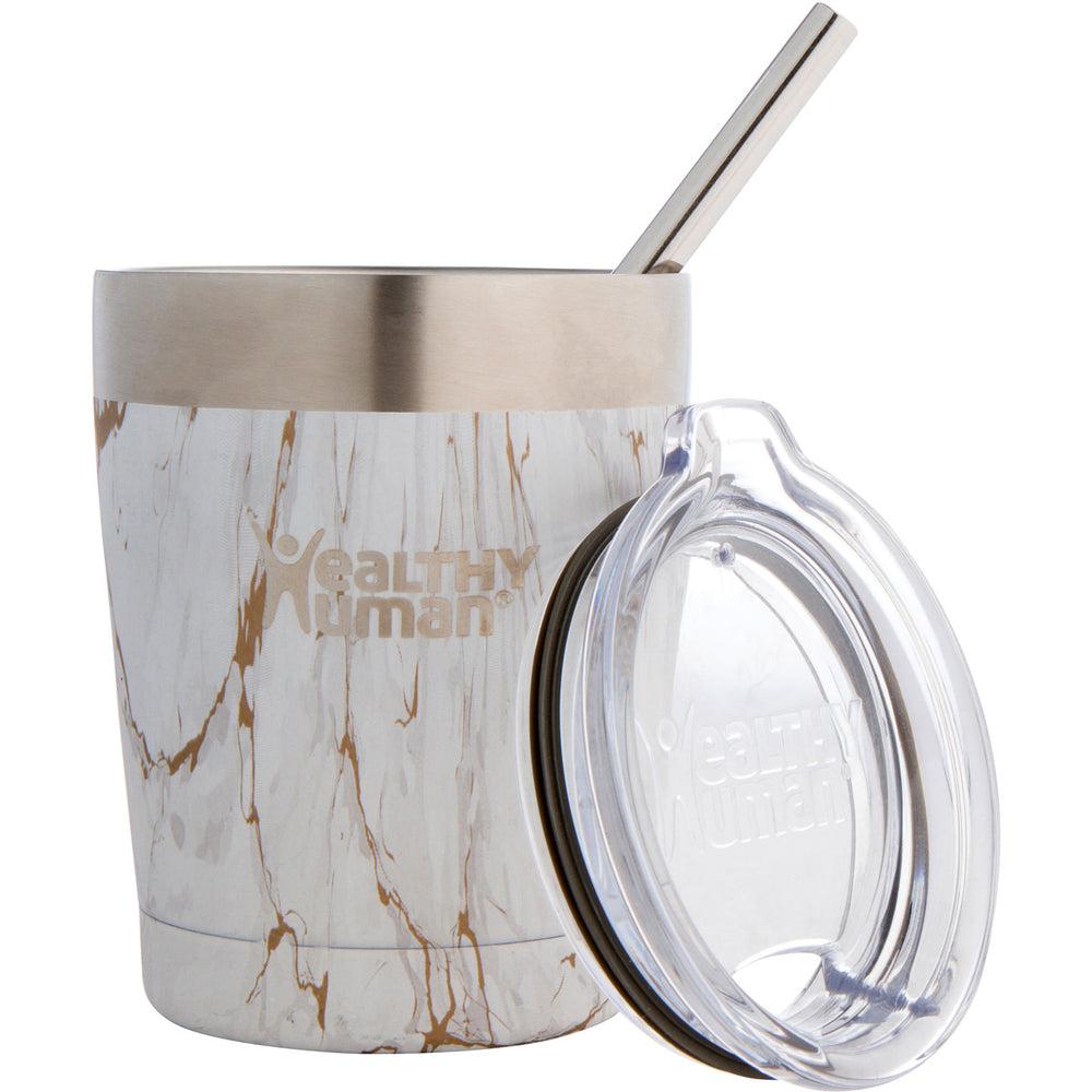- Leak-resistant lid and metal straw included