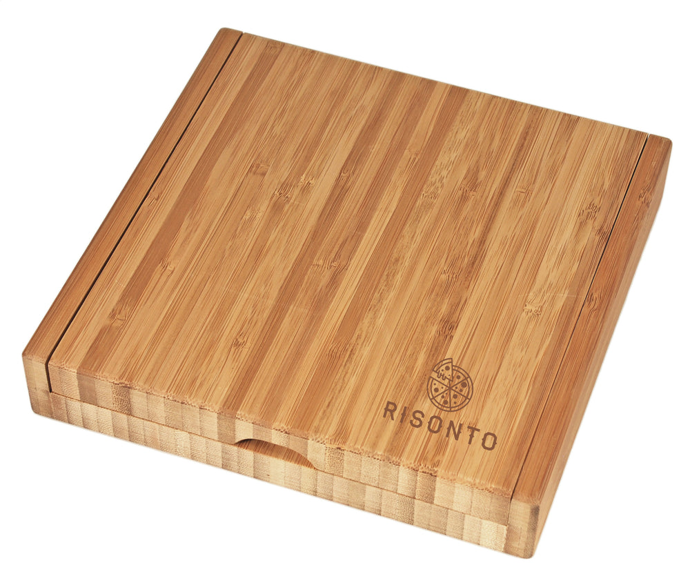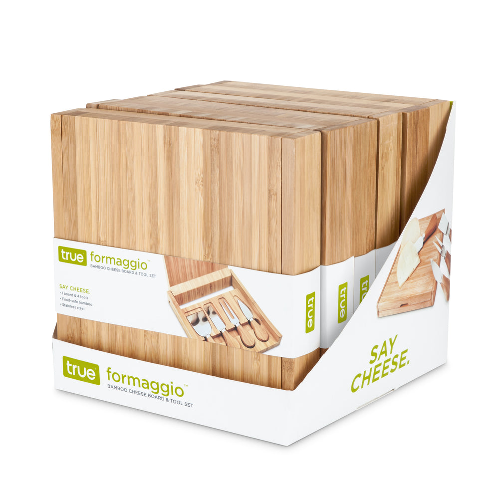 The Formaggio Bamboo Cheese Board & Tool Set incorporates everything you need for serving – add all the cheese your heart desires. Features a small spade knife, narrow plane knife, flat chisel and stout serving fork. The board opens to store all four at the ready for entertaining and outdoor adventures alike.
