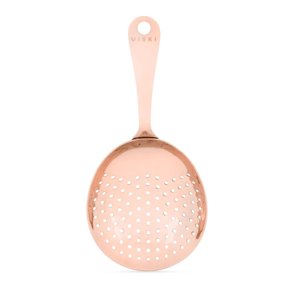 A bar essential as iconic as its eponymous drink, our professional-grade julep strainer is intrinsic to any finished bar set. Cast in stainless steel with a striking copper finish, this tool features uniform perforation across a bowl perfectly sized to fit standard and large mixing glasses.