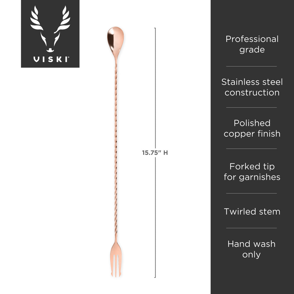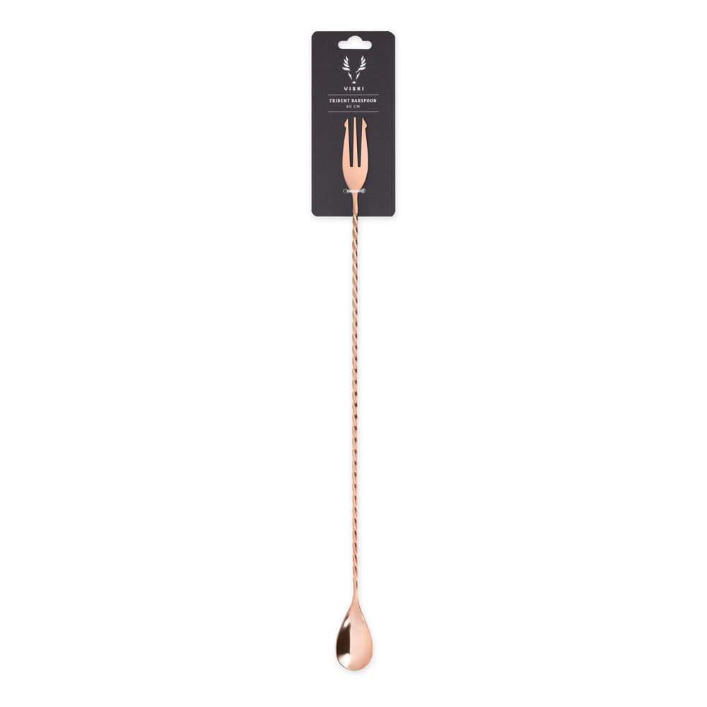 Designed for swizzling and stirring, our copper trident bar spoon sports a smooth spoon bowl and a forked tip at the stem's far end. A nod to the nautical, the trident also works for spearing the perfect garnish to cap your drink.