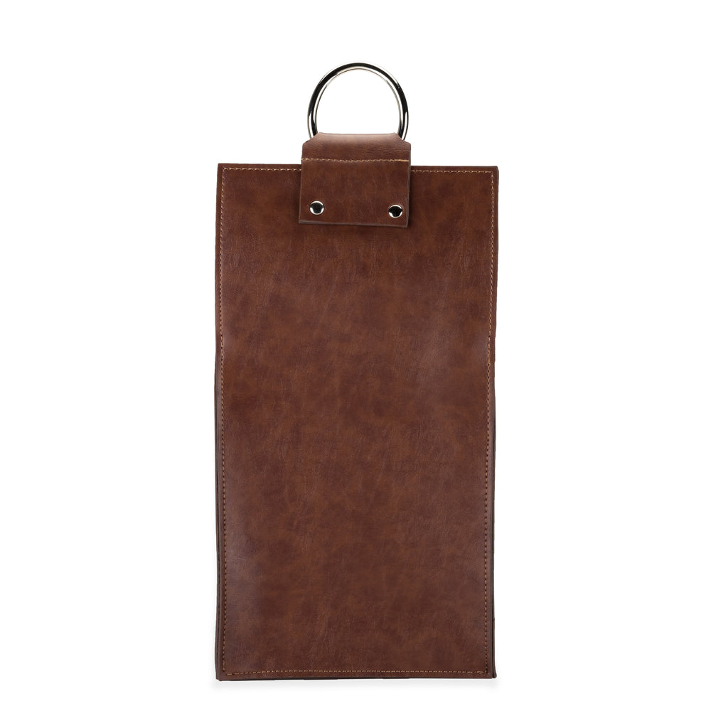 Inspired by travel from city to bustling city, our chestnut-colored faux leather double bottle carrier replaces flimsy bottle bags with something that will stand up to a tireless lifestyle. Features a snap closure, velvet cushioned divide and one sturdy metal handle.