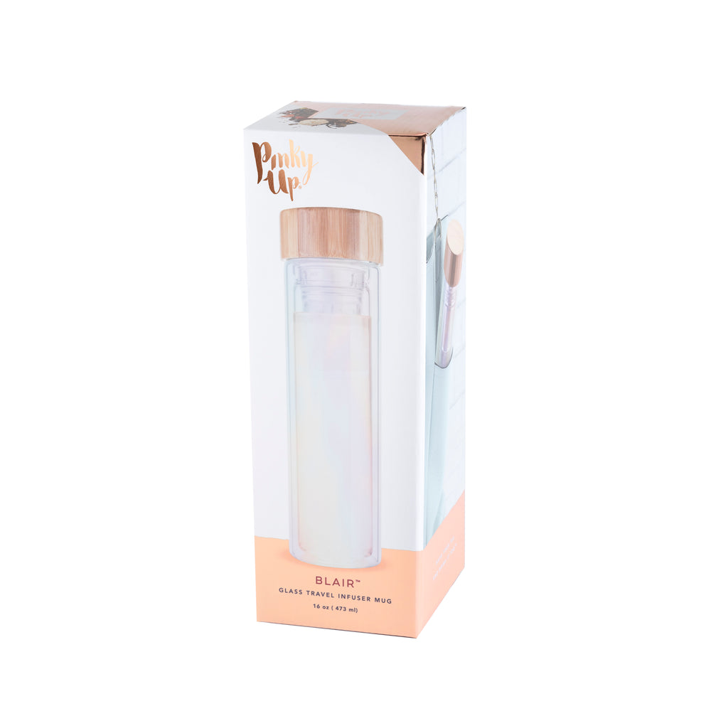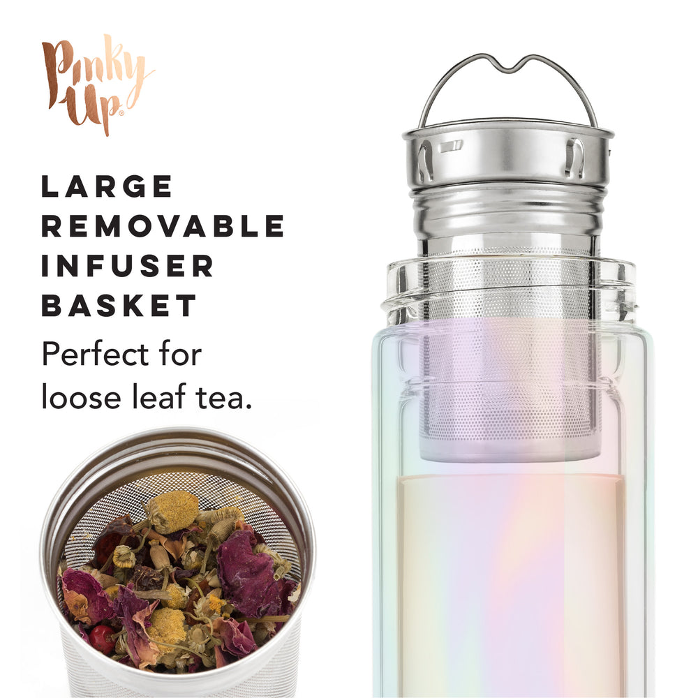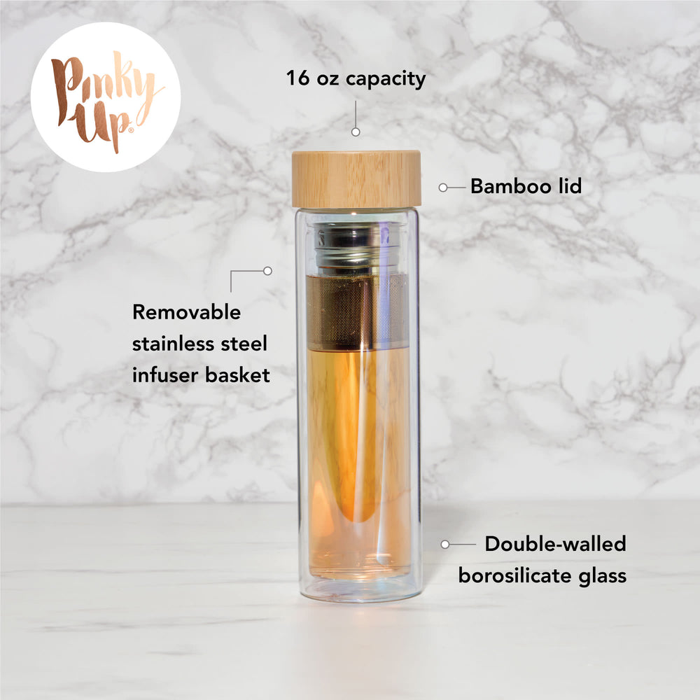 Take tea time anywhere with this chic portable infusing mug. This double-walled 16 oz. mug keeps drinks at the perfect temperature while staying cool to the touch. The Blair Glass Travel Infuser Mug includes a detachable strainer and infuser for loose-leaf tea.