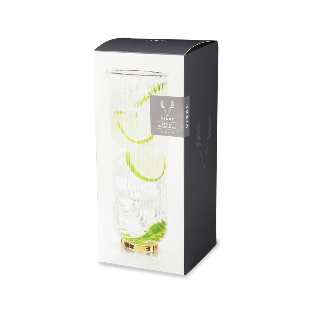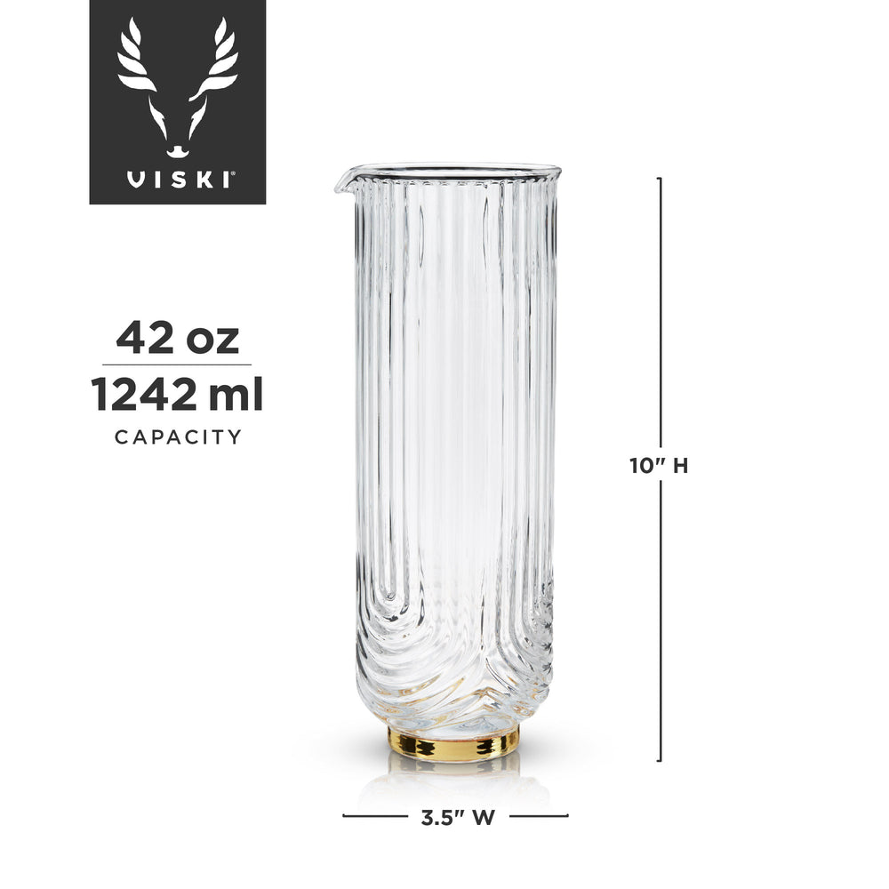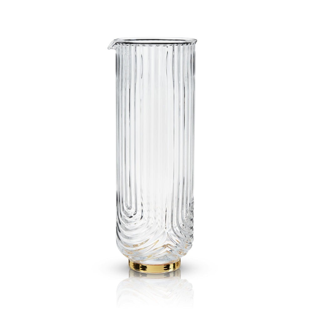 Polished gold and draping glass swathe the surface of this dashing carafe, adding a vestige of the Gilded Age to an already elevated piece. Fashioned from high-quality glass, it accommodates 42 oz, making it an exquisite vessel for your carefully crafted cocktails or beverage of choice.