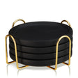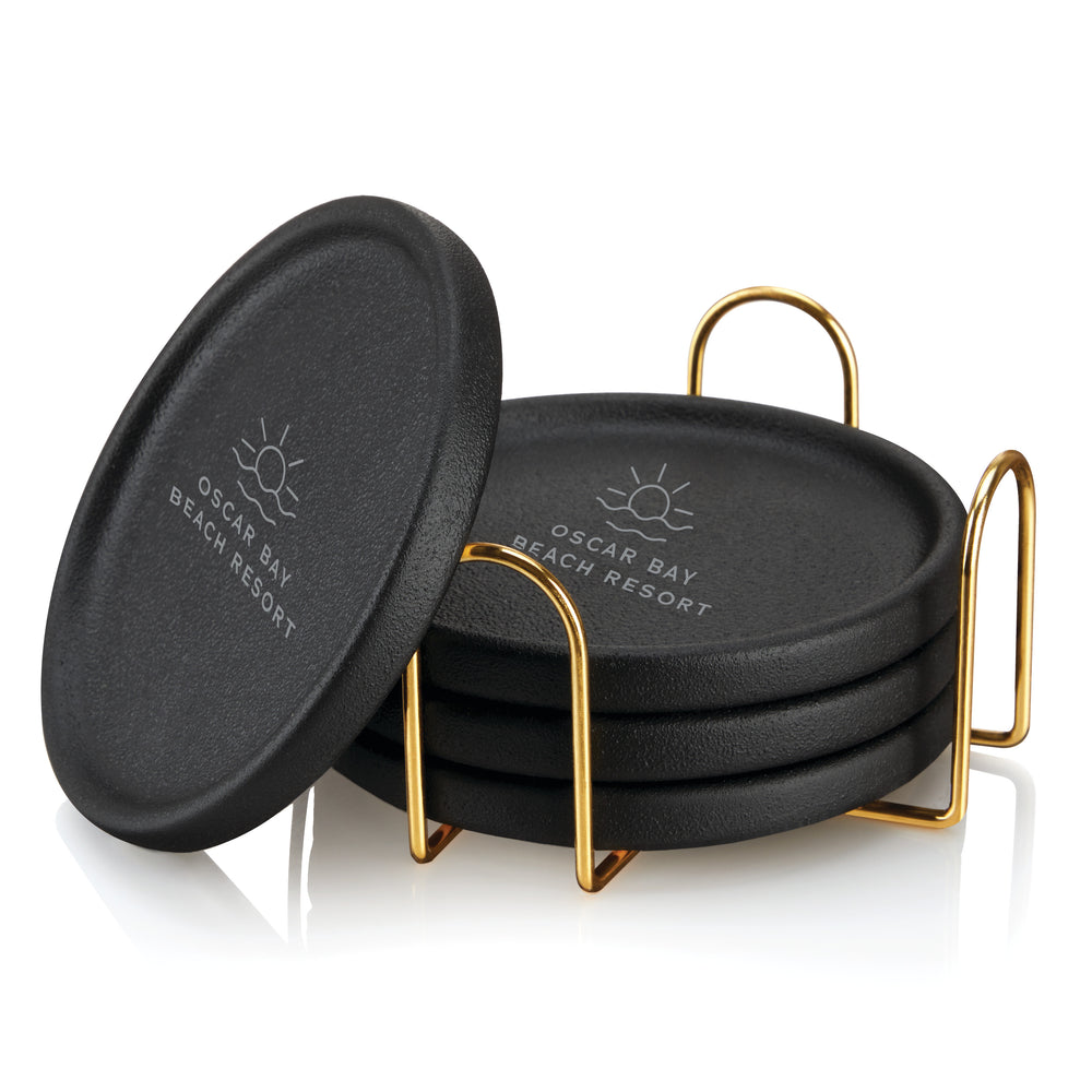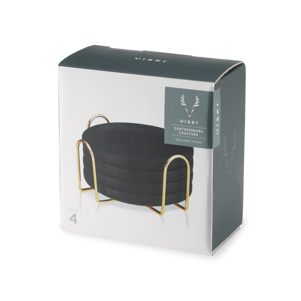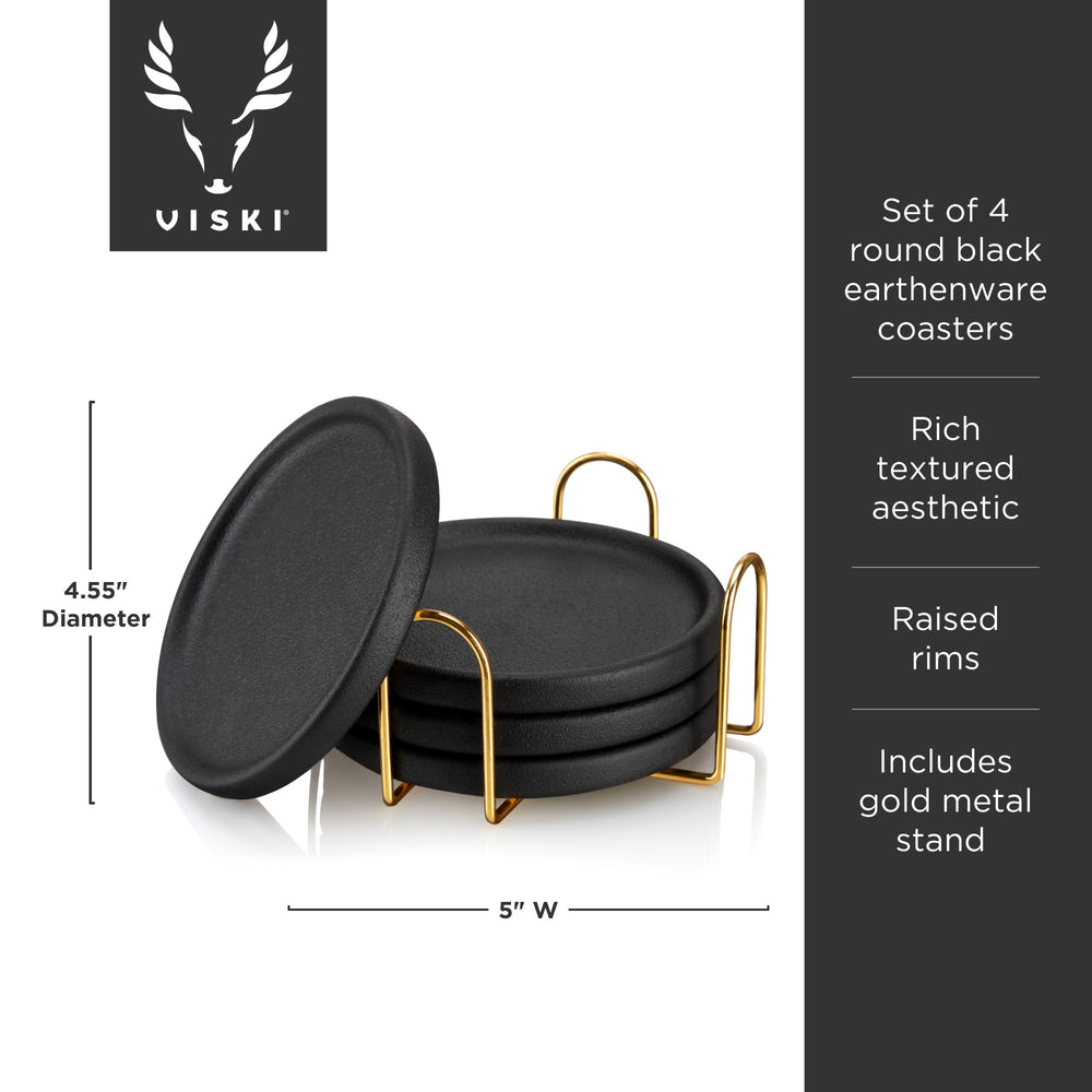 Sleek black earthenware makes these modern coasters stand out. Complete with raised rims to prevent spills and a gold stand for storage, this coaster set makes a unique addition to your home decor or a thoughtful gift for a friend.