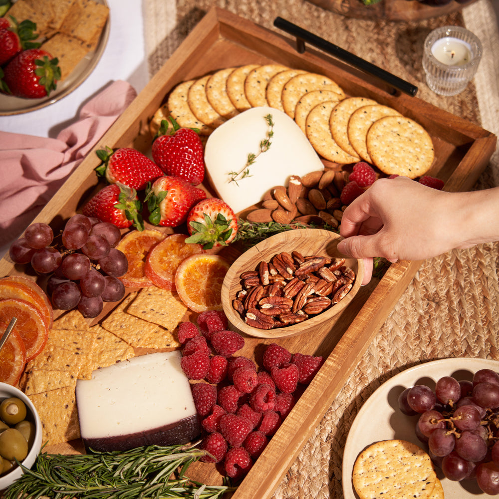 Whether you’re serving up a decadent cheese and charcuterie spread or using it as a stunning centerpiece, the Longboard Acacia Cheese Board adds warm, contemporary charm to your tablescape. The lip keeps appetizers from sliding off, while the black metal handles make it easy to transport. Pile it high with snacks or use it to display knick knacks and floral arrangements.