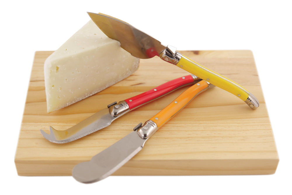 Our set of three Sunnyside Cheese Knives includes a fork-tipped spear knife for crumbling aged cheeses, a mini-cleaver for hard cheeses and a soft cheese spreader. The compact pine wood tray stores all three or flips over to double as a quick and handy cutting board.