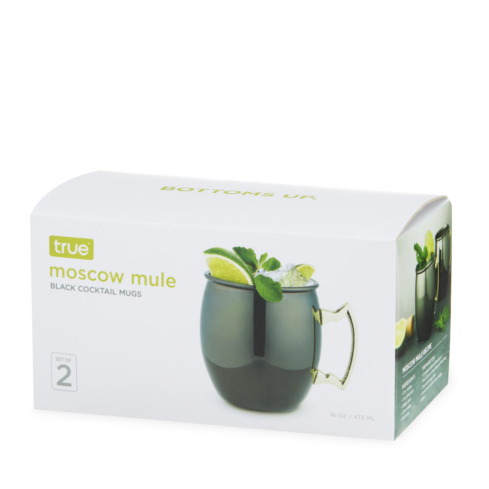 This set of two black and gold Moscow Mule mugs is a chic update to a classic. Crafted from restaurant-grade stainless steel, each mug features a polished black finish with an elegant golden zig-zag handle, perfect for serving Moscow Mules or any of your favorite cocktails. The generous 16-ounce capacity makes them ideal for entertaining.