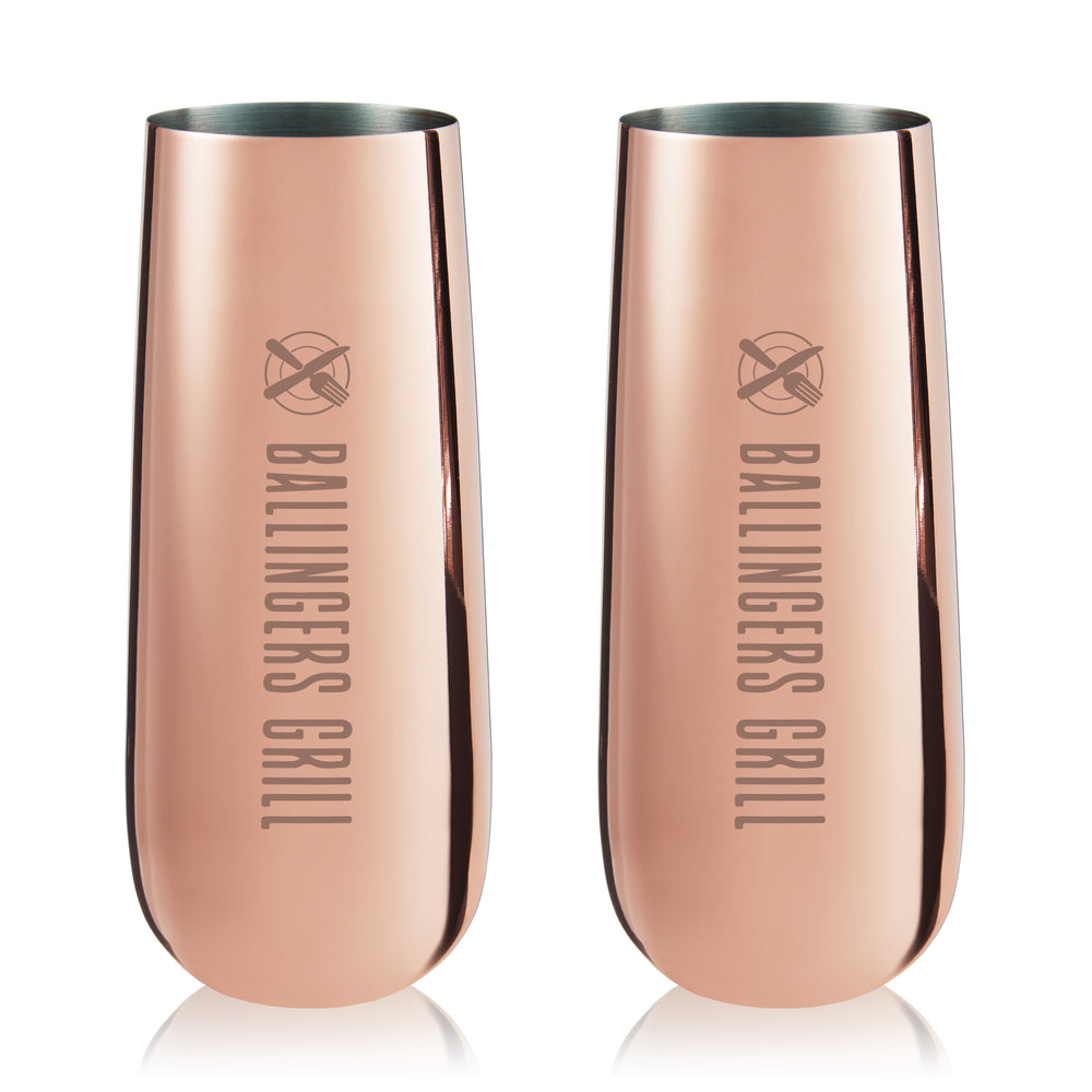 Polished and perfectly rounded to fit in the curve of your palm, these stemless champagne flutes look stunning on any tabletop. Gleaming copper plating catches the light, evoking luxury and warmth.