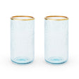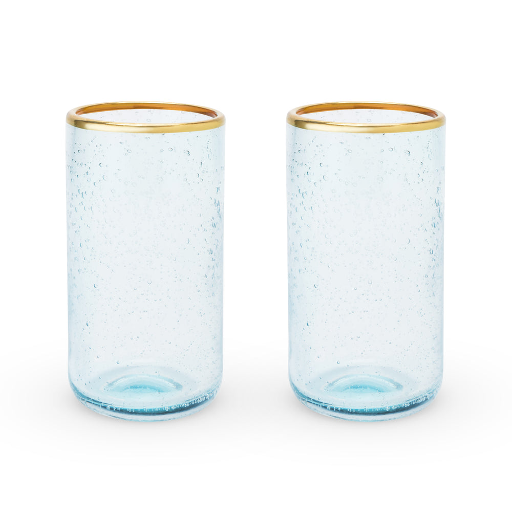 A series of delicate bubbles sit suspended in aqua-tinted glass while a laurel of gleaming gold plating adorns the rim, adding a vestige of intrigue to an already stunning set of glassware. Designed to contain 16 ounces comfortably, each tumbler is impeccably suited to accommodate any of your favorite mixed beverages.