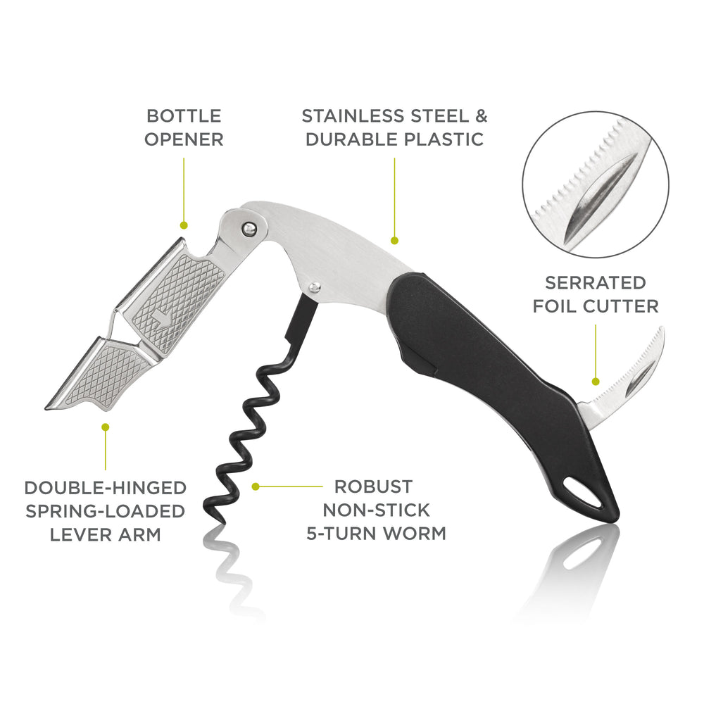 Our Black Professional Corkscrew features a double hinged design, classic 5-turn worm and foil cutter. Sturdy and trusted, you won't be disappointed with this wine bottle opener.