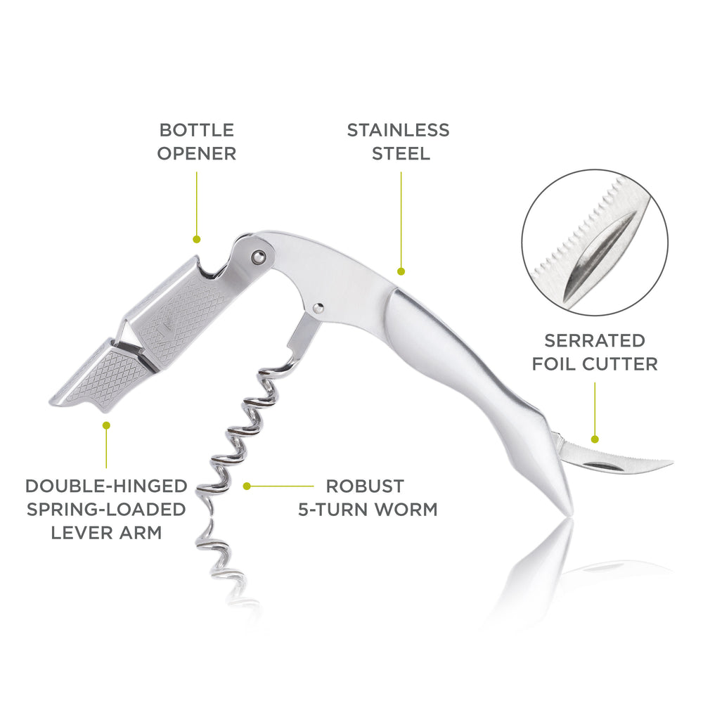 If you’re looking for an indestructible corkscrew worthy of your trust, you’ve found it. With a two-step spring-loaded lever, robust worm and serrated foil cutter, this sturdy opener thrives on hard work.