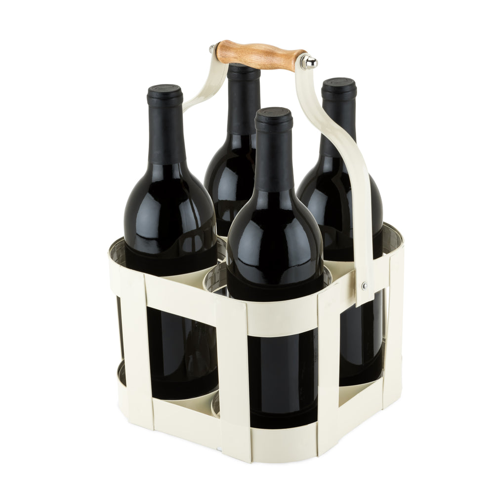 Painted metal and wood give this farmhouse wine holder a vintage look that brings warmth to any home or dinner party. Makes a great gift, but don’t forget the wine.