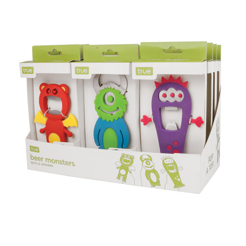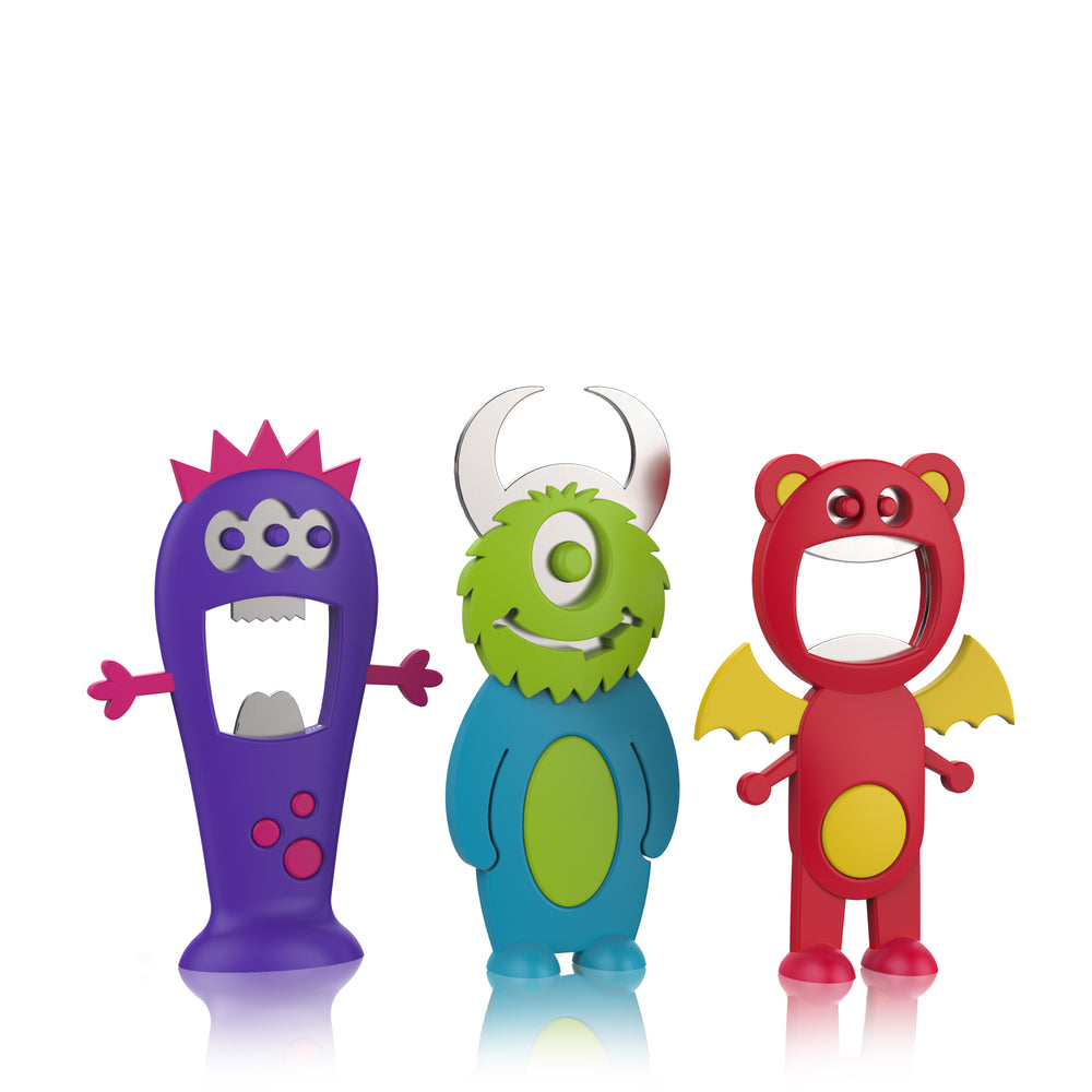 This monstrous opener is always searching for unwary beer caps to devour. Keep the frighteningly functional creature out of trouble by sticking him to the fridge with the magnet on back or to the countertop using the suction feet, or else he might just tempt you into having another beer.